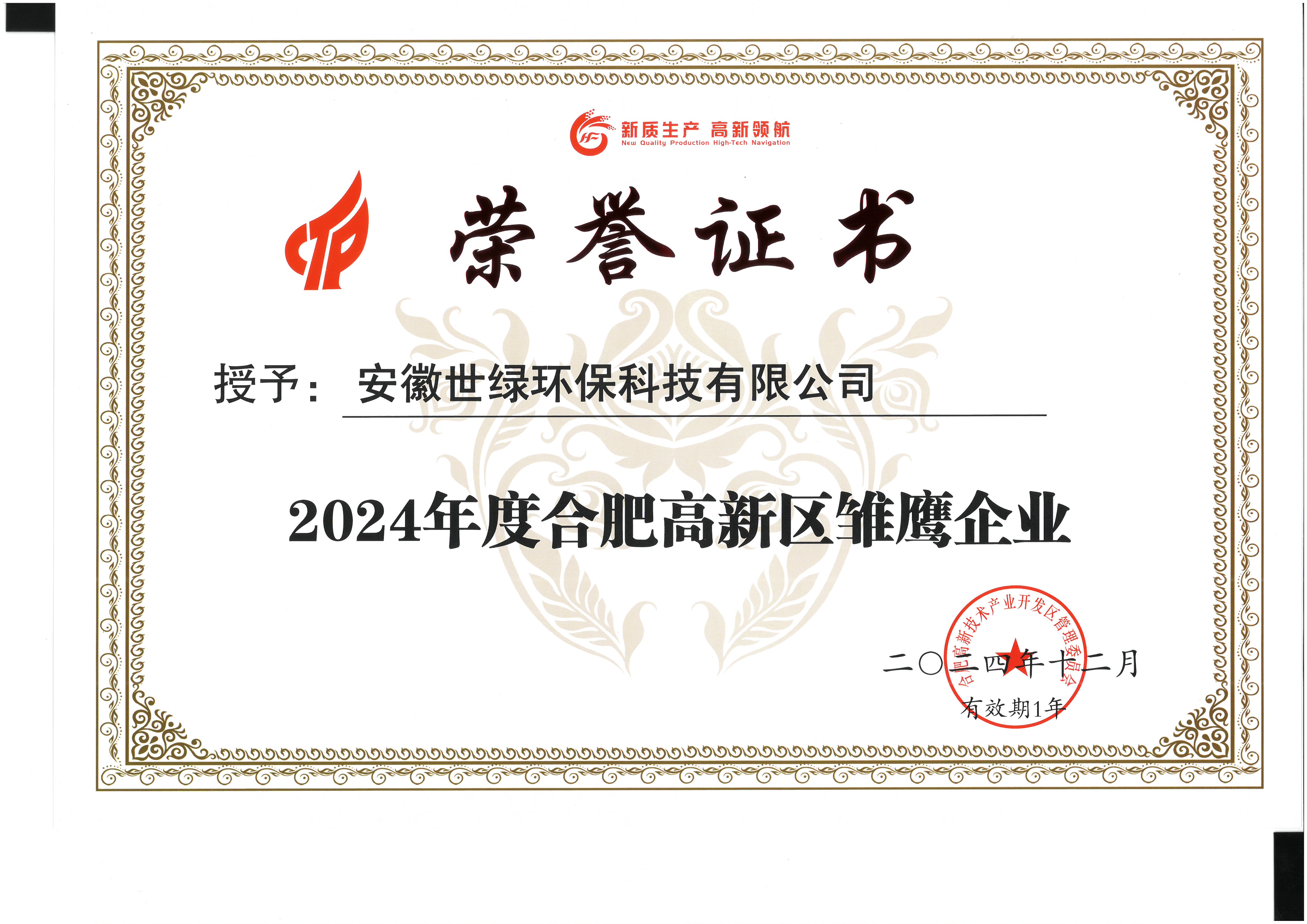 在2024年的尾聲,安徽世綠環保科技有限公司憑借其卓越的創新能力和在環保領域的杰出貢獻,榮獲了“2024年合肥高新區新質生產力企業”的稱號。這一榮譽不僅是對世綠環保科技長期以來努力的肯定,更是對其在推動環保產業發展、促進生態文明建設方面所做貢獻的高度認可。
